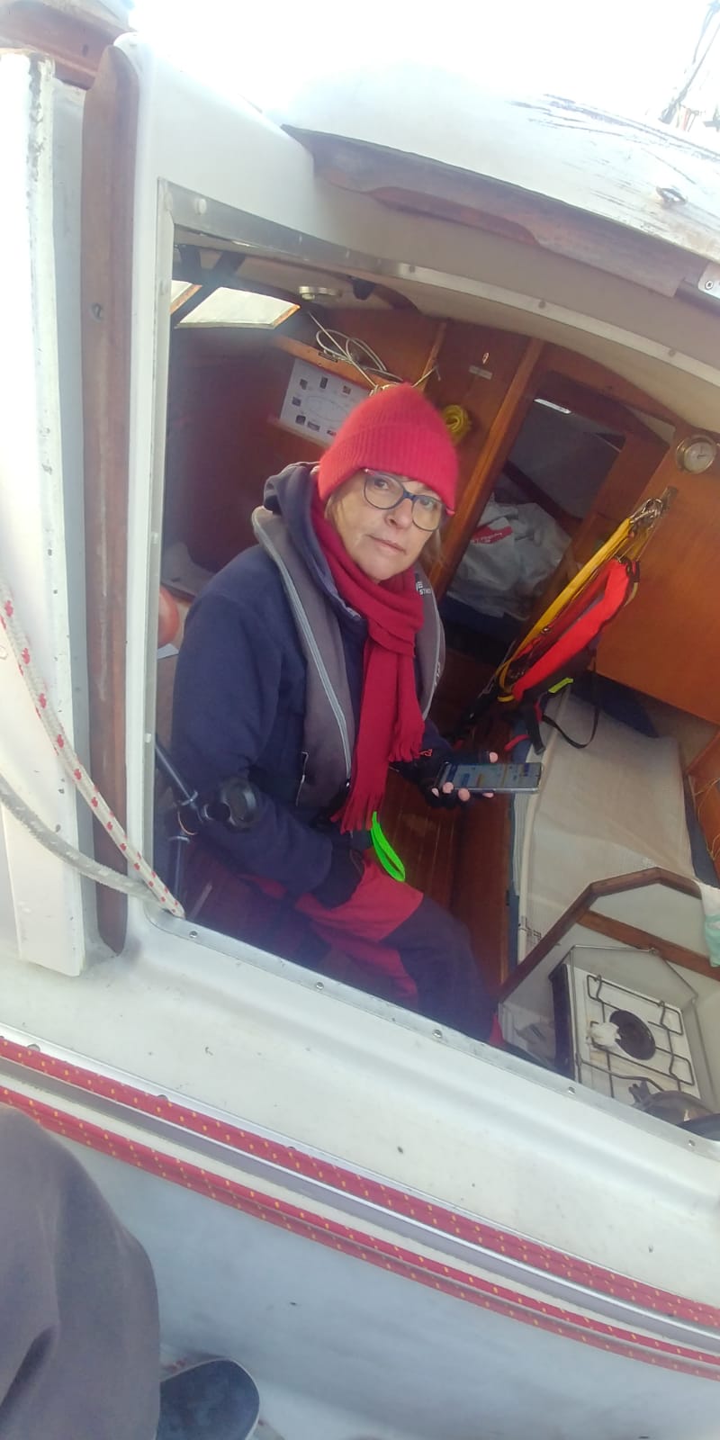 De Sainte-Catherine, Dominique fait l’appel à la VHF (sur le 16 à Beg Melen. après une tentative au 10 dans un premier temps, mais sans succès. Nous sommes reçus faibles et peu clairs.)