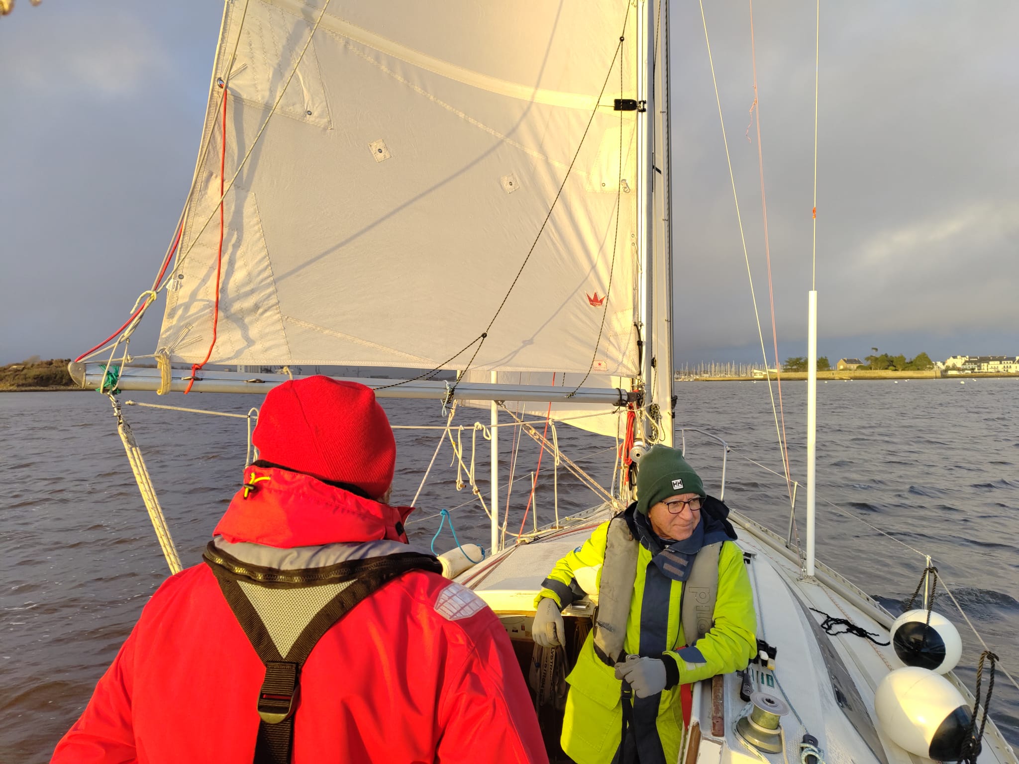 Une fois sortis par la passe ouest, nous passons la matinée à alterner navigation au près et au portant, avant de gagner Port-Tudy pour déjeuner et prendre un café.