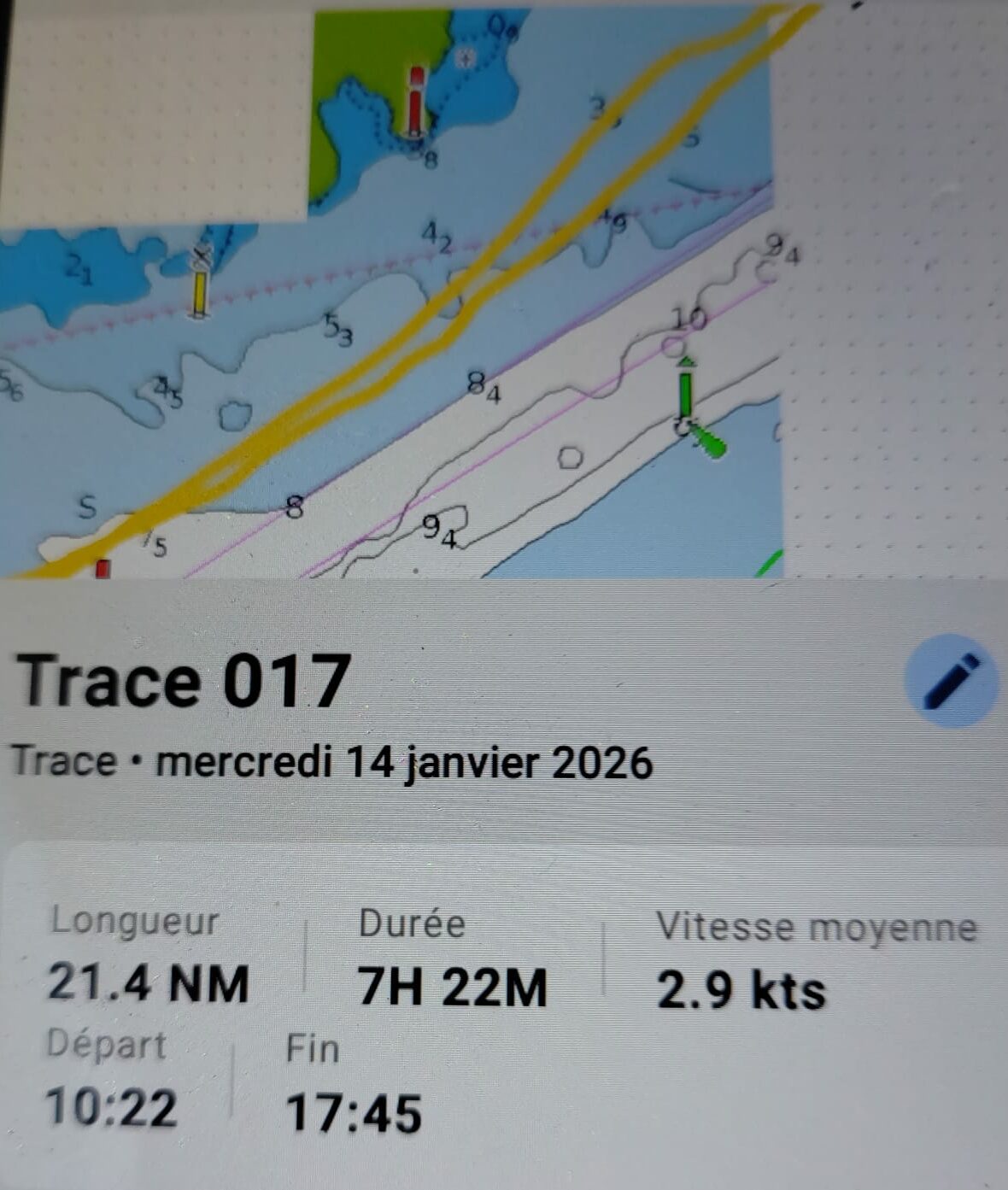 21,4 M pour 7h22. Faible moyenne de 2.9 N avec un bateau sous toilé par manque de génois et de spi !