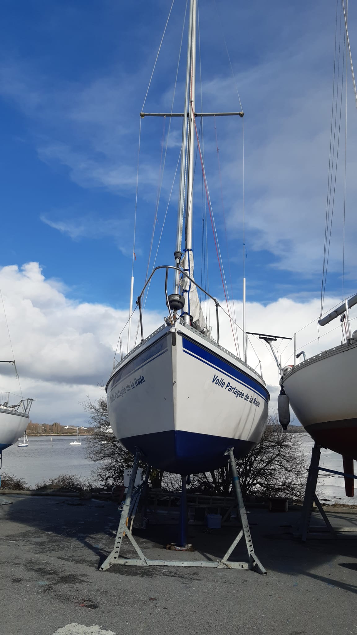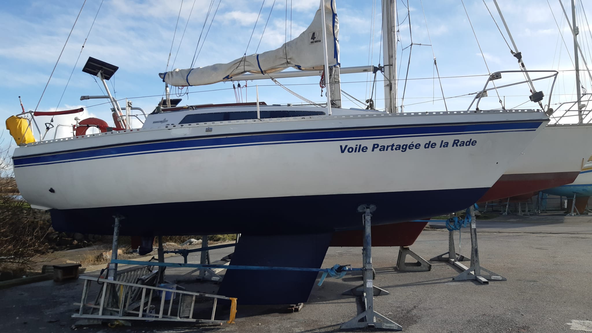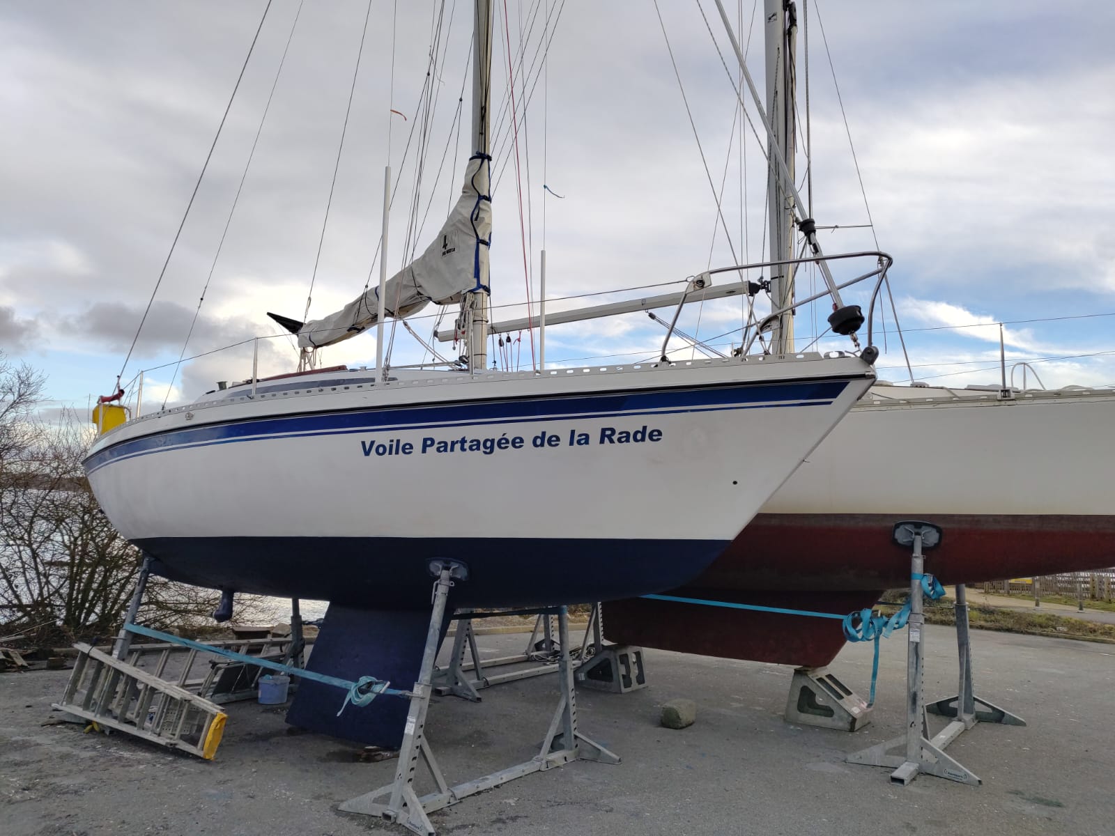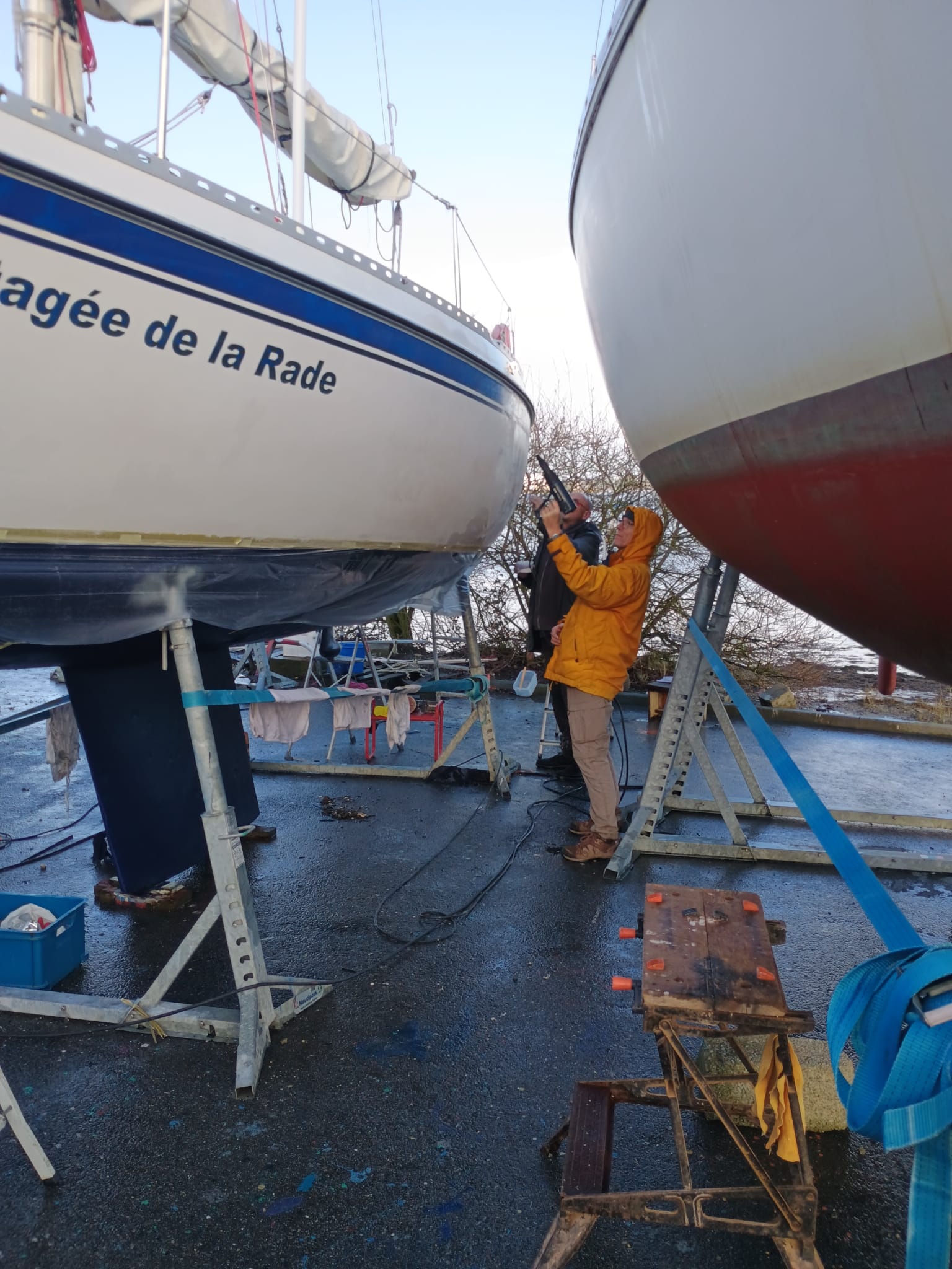 Sorti de l’eau hier vendredi en fin de journée, avant notre assemblée générale, Camulogène est entré en chantier pour son carénage annuel.