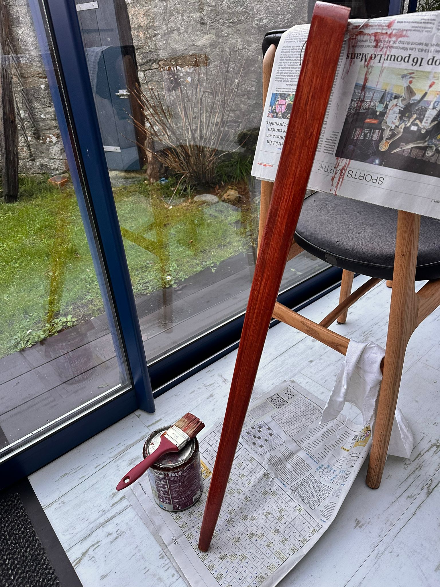Lancé du balcon, je suis en train de le hisser quand Claudie nous alerte d’une déchirure qu’elle aperçoit. À peine en tête, nous affalons illico.
