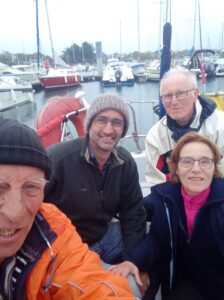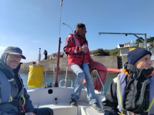 Michel C., chef de bord, est sorti avec Clément, Nadine et Pierrick.Pierrick, qui vient d’adhérer, fera le tour de préparation du bateau puis avec succès l’essai VHF et le démarrage du moteur.Nadine sortira le bateau à 9h55 et nous nous aidons du moteur jusqu’à la Citadelle car le vent de