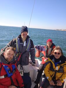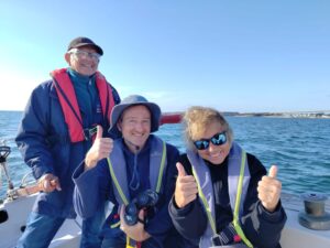 Éric, chef de bord, est sorti avec Claudine P., Catherine D., Patrice C. et Claude J.Superbes conditions pour une sortie : tour de Groix dans le sens des aiguilles d’une montre, avec pause déjeuner à port Saint Nicolas.Beaucoup de monde à Saint Nicolas.Claudine a fait la sortie, Claude la VHF,